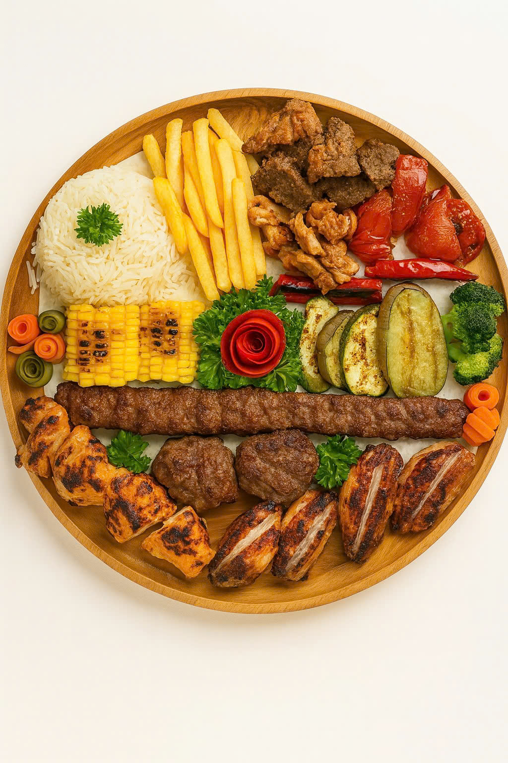 - 1 Adana kebab, 4 Chicken wings, 4 Chicken skewers, 2 Lamb meatballs, Lamb doner kebab, Chicken Doner Kebab, basmati rice and french fries, grilled vegetables, sauce.